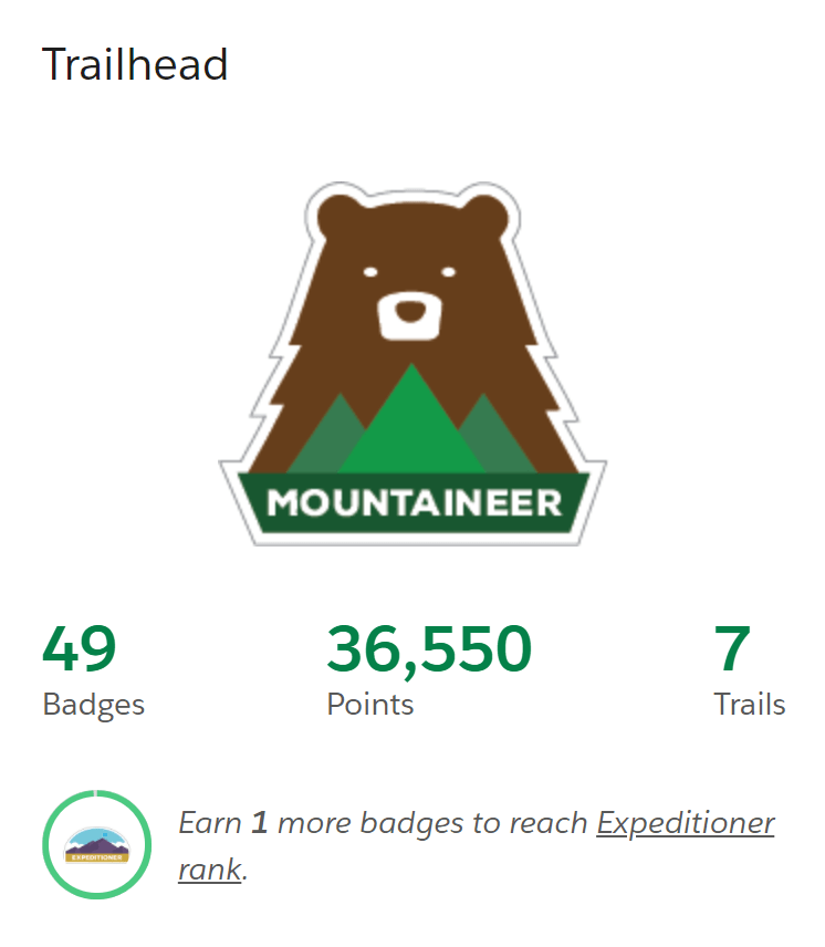 There are a lot of study guides available in addition to Trailhead. I’ve also been using Focus on Force and Mike Wheeler Videos. They are helpful for sure; I’ve realized I learn so much better listening and watching as opposed to just reading. The added context and visualization help the processes sink in. A refresh on Identity and security today, as well as Standard and Custom Objects. I’m also close to moving up in rank on Trailhead from Mountaineer to Expeditioner….a few more badges and points and I’ll be there. This one has kind of crept up on me, which I guess is a bonus of being so focused on moving forward I was not thinking about other things I am achieving at the same time.