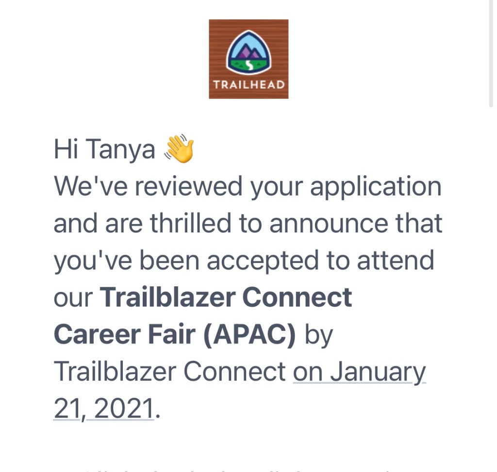 The last few days have seen some big changes/opportunities. First I was accepted to the Trailblazer Connect Career Fair. This is exciting on multiple levels, namely exposure to some wonderful companies who are both partners and clients of Salesforce. Networking is a huge part of the job search, and I’m so grateful for this. Nervous too, don’t forget that! Interviewing techniques and strategies are on my to-do list, as well as company research.